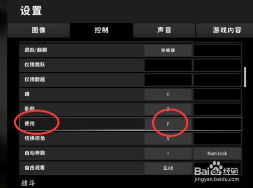 在节制设置下我们需要找到一个利用的按钮设置,这个设置什么意思呢,在游戏默认的设置里当我们接近车辆的时辰按F就可以进入到车子里面了。