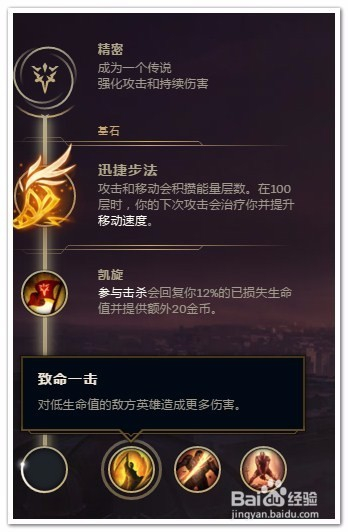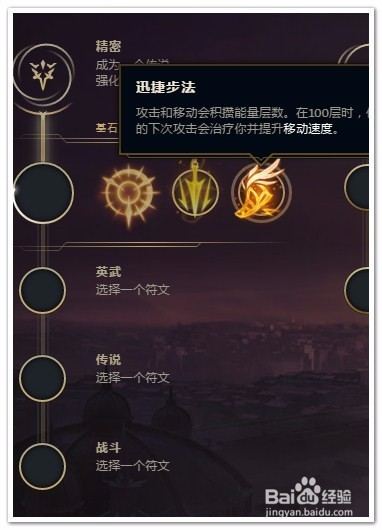 在三个基石里选择“迅捷步法”。刷野时会频仍触发加快治疗结果,若是追击英雄平A触发此结果,可以多打出几下平A,GANK时或者反野时就可以据有优势了。
