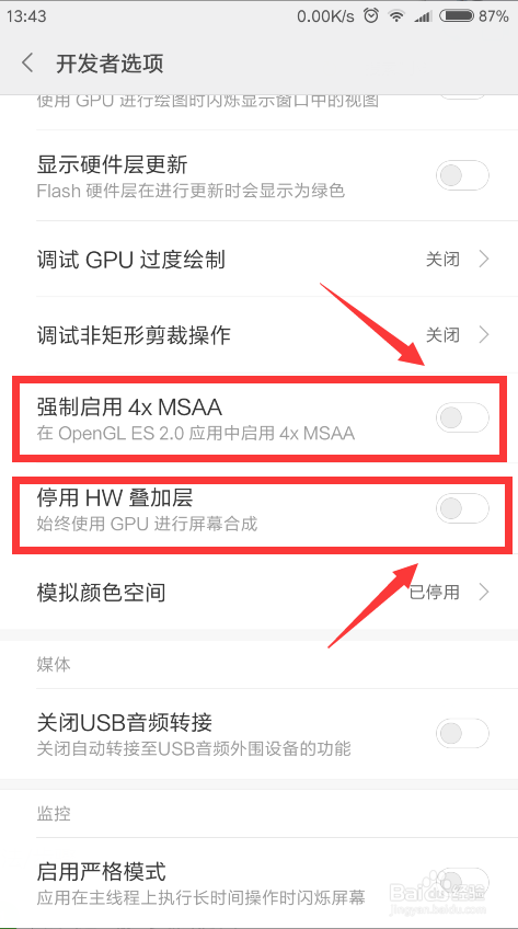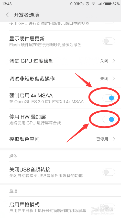 接着我们标的目的下滑动,找到“强制启动 4X MSAA ”按钮和“停用HW叠加层 ”按钮之后,把它们都打开 。