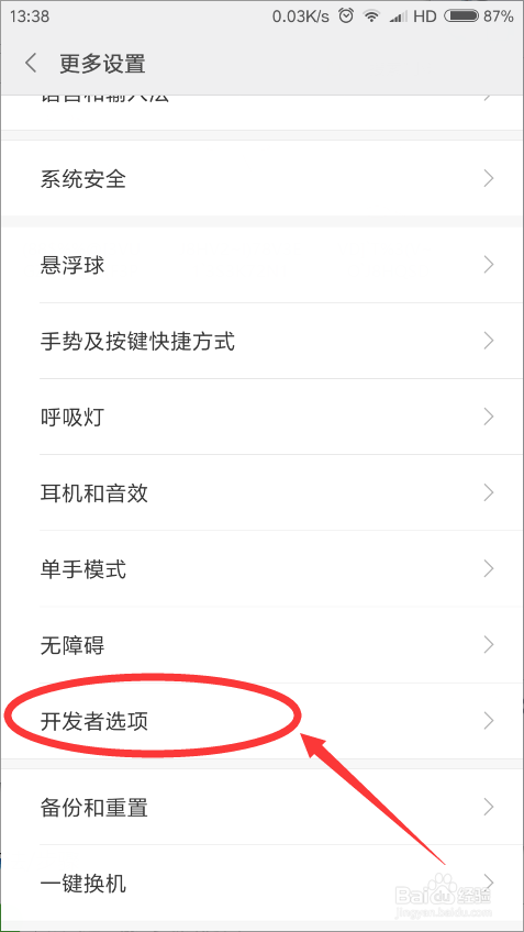 接着我们标的目的下滑动,找到“ 开辟者选项 ”按钮之后,我们再点击打开它 。