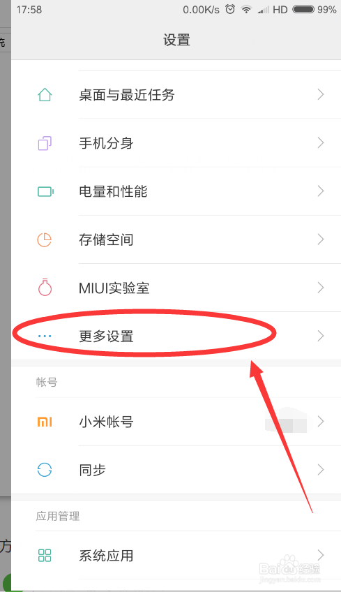 然后,我们打开“设置 ”页面,标的目的下滑动,找到“更多设置 ”按钮,点击打开 。