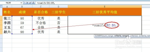 例如,小编想计较三勤学生傍边得优异成就的平均值,则在“三好优异平均值”单位格输入公式:“=SUMIFS(B2:B5,C2:C5,"优异",D2:D5,"是")/2”。