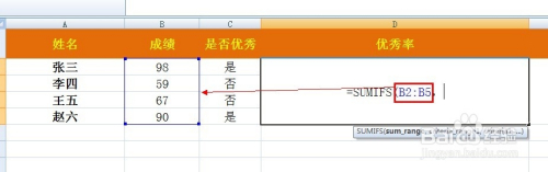 是以在优异率(平均分)计较单位格输入的公式为“=SUMIFS(B2:B5,C2:C5,"是")/2”即可。