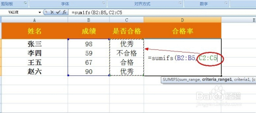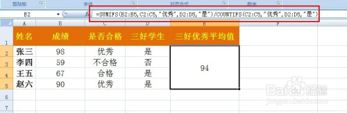 因为countifs函数与sumifs函数利用方式不异,是以,我们可以将公式进行改良为“=SUMIFS(B2:B5,C2:C5,"优异",D2:D5,"是")/COUNTIFS(C2:C5,"优异",D2:D5,"是")”。