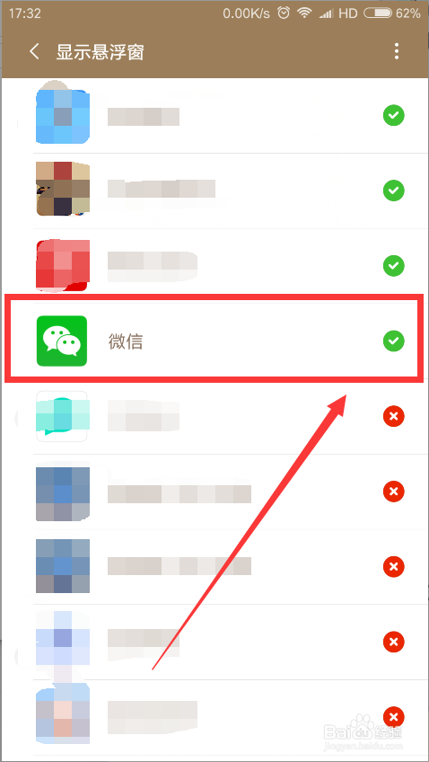 接着,我们就会来到各类应用的悬浮窗口设置页面,我们点击“微信 ”按钮 。