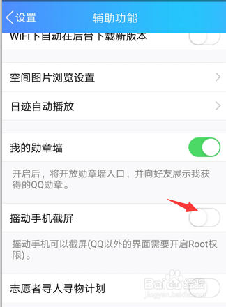 开启“摇脱手机截屏”,这个功能再qq以外的界面需要开启root授权,如许手机轻轻摇一摇就可以截屏了。