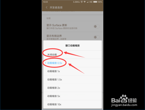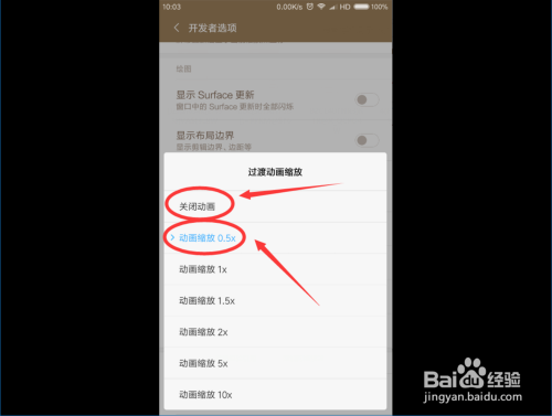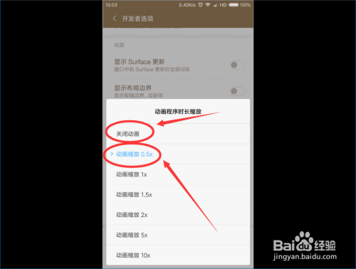 点击“窗口动画缩放 ”按钮,然后把动画缩放选择为“动画缩放0.5X ”,若是手机很卡打开软件很慢的小伙伴也可以选择“封闭动画 ” 。