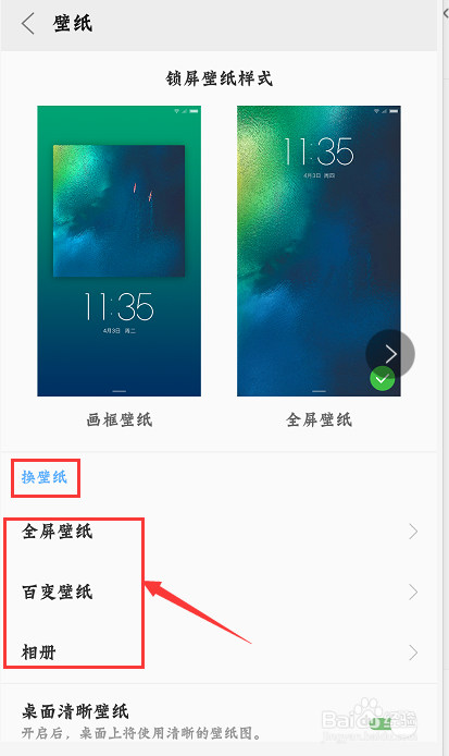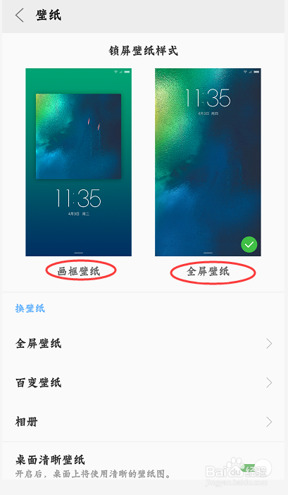 看到里面的锁屏壁纸有“画框壁纸”和“全屏壁纸”两条目样式。选择本身喜好的样式。