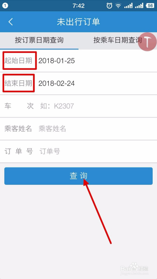 在未出行订单中,我们会看到有两种查询体例,默认就是“按订单日期查询”(就是采办火车票时辰的日期),我们选择肇端日期和竣事日期后,我们点击“查询”按钮。