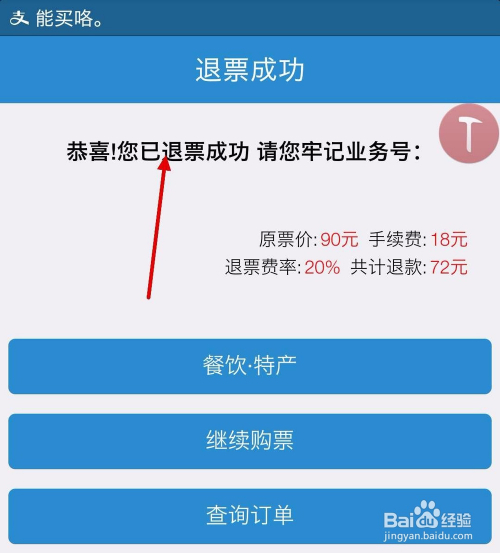 我们点击后,就会看到一个“退票当作功”的界面,如图。