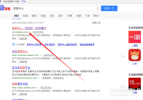 首先需要进入卖家中间,可以从百度搜刮进口进入,如下图直接搜刮卖家中间,点击进入。当然你也可以从其他渠道进入好比千牛等等。
