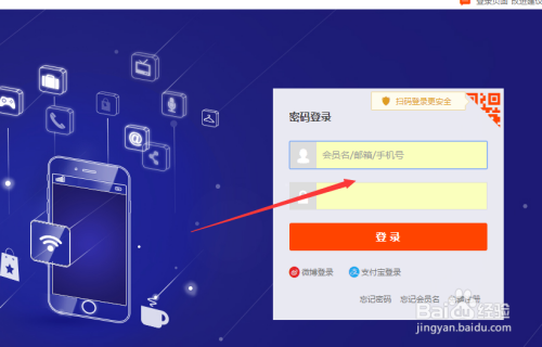 点击卖家中间后,期待页面跳转到登入页面,点击输入账号密码或者利用手机扫描功能登入,这个按照自身选择即可。如下图所示