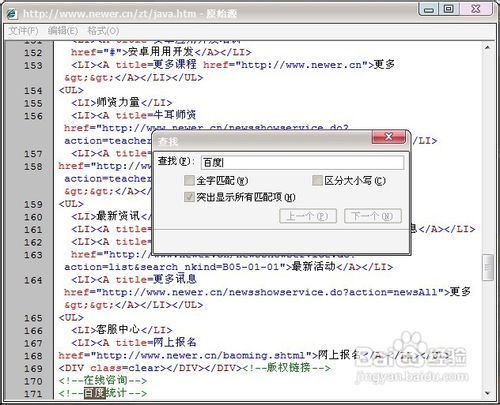 点击源文件之后我们就能看到这个页面的源代码了。我们可以往下拖动找到你需要的不克不及复制的内容。我们也可以利用快捷键Ctrl+F来查找!!