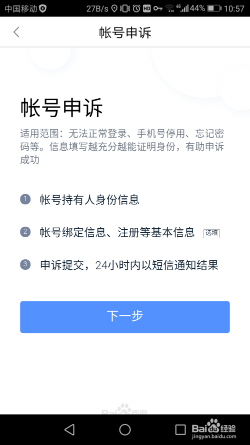 大师先浏览一下这里的信息,这是一些申诉的注重事项,之后点击“下一步”。