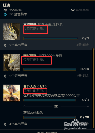 告竣使命方针就可以获得春节元宝了。好比我这里选择这个使命,对局里对处所造当作15000危险或20次助攻就能获得4个春节元宝。