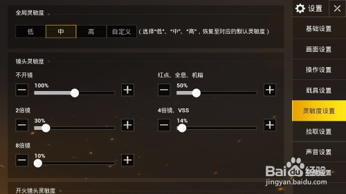 在调整过程傍边,不开的可以设置到最高,红点影响比力小,可以开的高一些,之后的2倍、4倍、八倍,幅度越高,活络度要设置的越低,否则开的时辰过分晃悠欠好瞄。