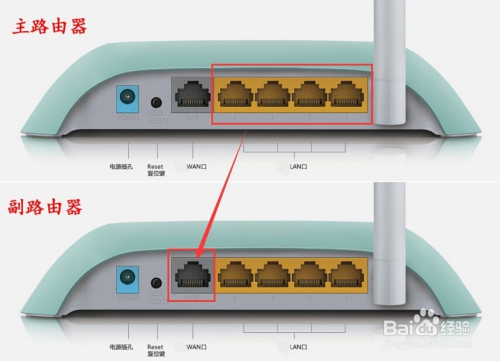 网线一头接本家儿路由器的LAN口,一头接副路由器的WAN口。