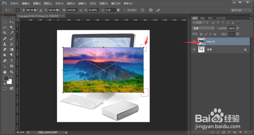 鼠标选中风光图层,打开自由变换东西[快捷键(Ctrl+T)],如图所示,图片四周呈现矩形小点,暗示已经进入自由变换状况,