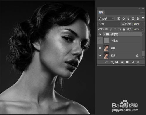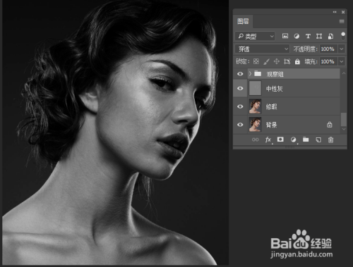 5.点击“图层”— “新建” — “图层”,定名为中性灰,参数如图所示(图一)。点击画笔东西,调整不透明度为10%,流量为5%的柔边圆画笔,脸部暗的处所用白色画笔,亮的处所用黑色画笔涂抹,可以削减眼部四周的细纹和法令纹。