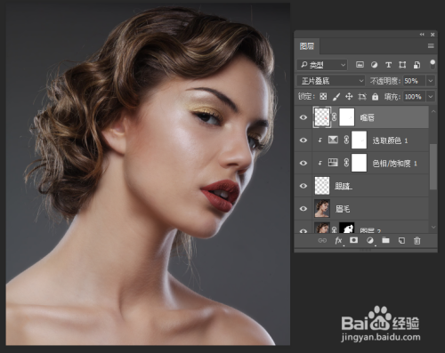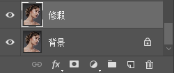 3.点击“污点修复画笔东西”“修复画笔东西”“修补东西”,共同利用,去除模特脸上的痘痘和痣。将图层1定名为“修瑕”。