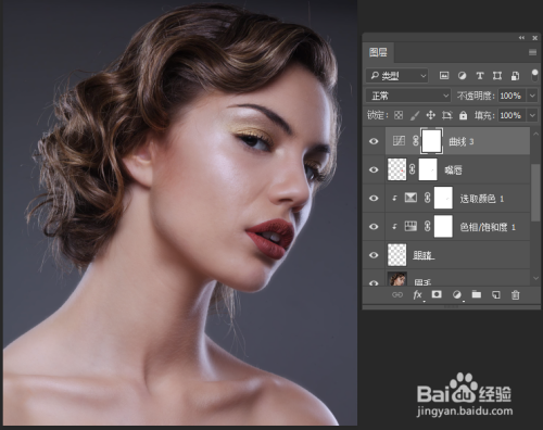 11.添加“曲线”,调整“蓝色曲线”使皮肤变白,调整整体曲线使明暗凸起。