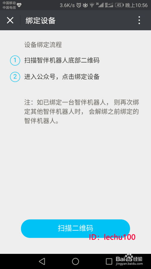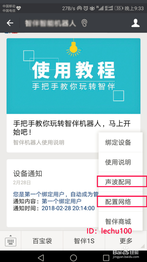 在微信里面的菜单里找到声波配网。(需要先打开机械人,没绑定的用微信扫一下机械人下面的二维码。)