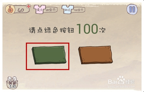 史上最坑爹的游戏攻略第二关:这关很是的无厘头,就是按照游戏的申明“请点绿色按钮100次”,点吧。此中要注重的就是,绿色和黄色的按钮会呈现更调。