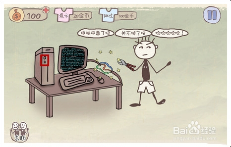 史上最坑爹的游戏攻略第一关:点击图片红框的按钮,就是左边电脑的本家儿机的开机按钮即可,是不是发现被钳子误导了呢?嘿嘿。