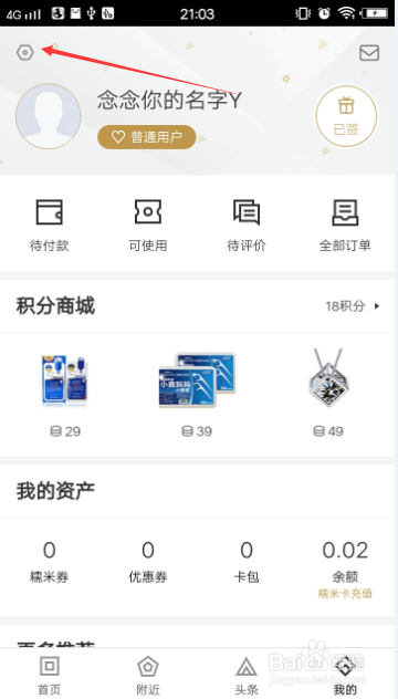 打开百度糯米“我的”本家儿页,点击左上角的螺丝图案。