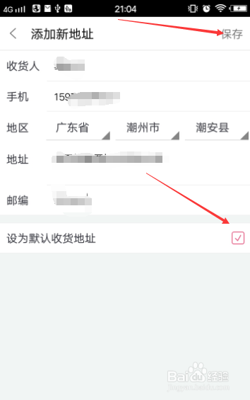 填好后点击“保留”,第一个添加的地址会设置当作默认地址,要打消默认的话,把后面的勾勾失落。