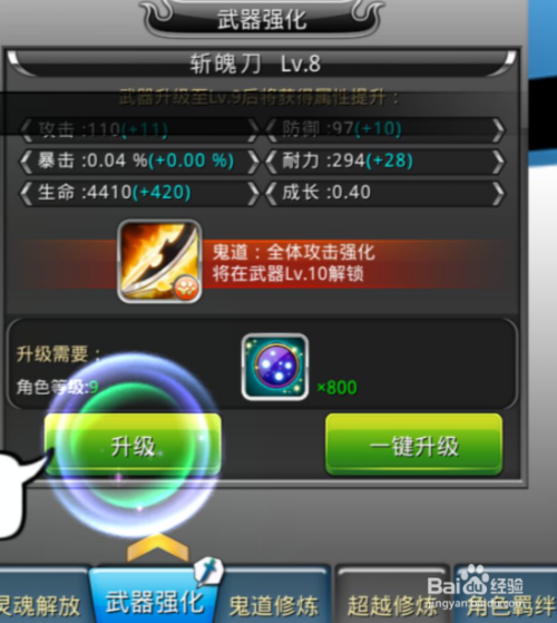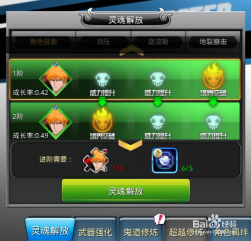 点击底处的格子——“魂灵解放”,把进阶所需的卡图凑好,可以对威力和境界冲破。鬼道的兵器也轻按,加以进级。