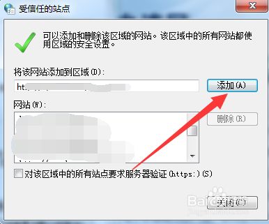 此时会设置界面,点击“平安”进入子选项页面,再点击受信赖站点选项后,点击箭头指的站点按钮,新弹出界面添加该网站即可。
