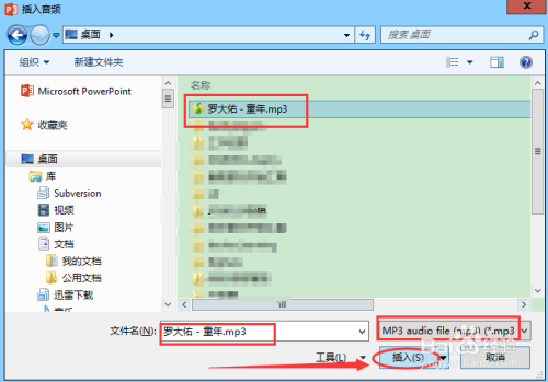 然后弹出插入音频界面,选择当地的音频文件,小编选择了童年作为布景音乐,最后点击插入