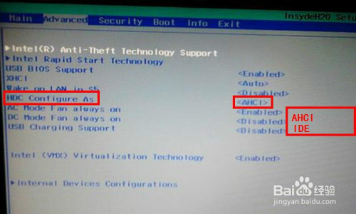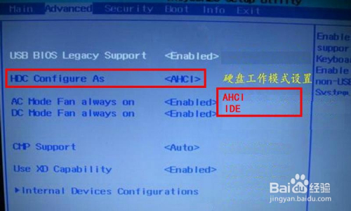 这个硬盘模式在Advanced这个选项下面,将HDC Configure as的值,由AHCI改为IDE,同样要按F10保留退出。