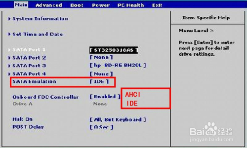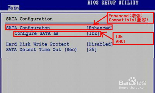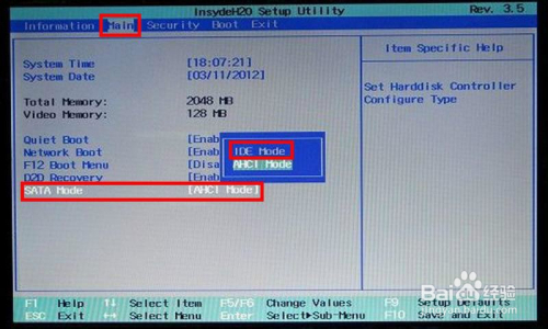 进入BIOS之后,选择Main选项,找到其下的SATA Mode这一英,将其值由AHCI改为IDE,按F10保留退出。