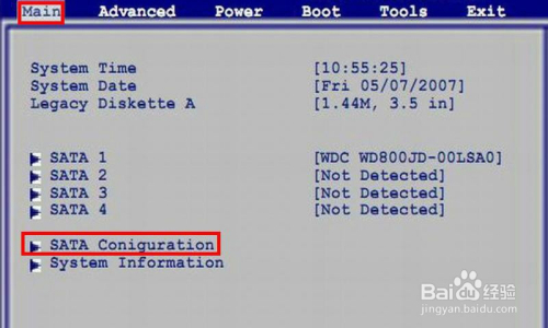 1,进入华硕的BIOS,选择Main选项,然后在其界面下选择SATA Coniguration这一项,按Enter进入子项。