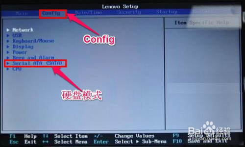 2,然后在Config选项下,找到Serlal ATA (SATA)这一项,这一项就是硬盘模式,选定它,按Enter键。