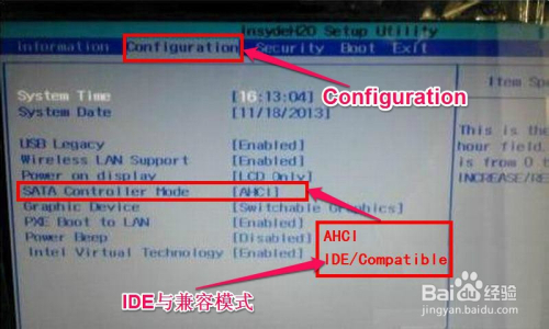 前面进入BIOS细节就不讲述了,只讲述找到硬盘模式这个处所就可以了,这个硬盘模式在Configuration选项,其硬盘模式这一项为SATA Controller Mode。将其值改为IDE或Compatible就可以了,按F10保留退出。