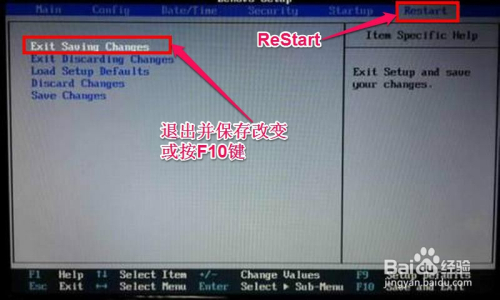 4,然后在Restart选项,选择Exit Save Changes这一项,此中辞意思是退出并保留设置,也可以按F10进行保留退出,重启电脑后,即可在PE中看到硬盘盘符。