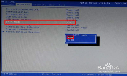 戴尔电脑进入BIOS后,其硬盘模式在Advanced选项,然后在其下找到SATA Mode这一项,将其值由AHCI改ATA即可,按F10保留退出。