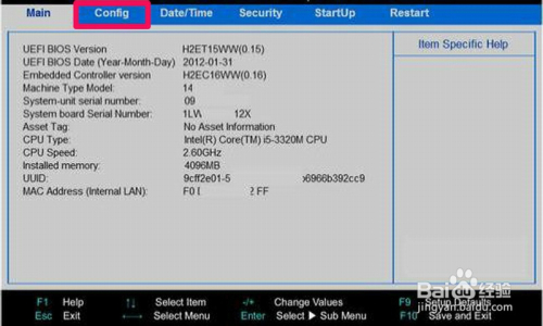 1,进入BIOS后,显示的是Main这个界面,要把光标移到Config这个选项上来。