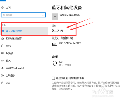 最左侧列表蓝牙及设备界面,我们可以找到开启蓝牙的界面,点击蓝色按钮开启蓝牙功能,鼠标键盘,音频和其他设备都能经由过程蓝牙进行办理。