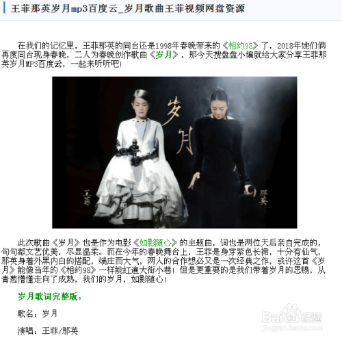 第二:搜刮之后,在百度的首页展示栏里我们可以看到“岁月王菲那英mp3下载‘’或者“王菲那英岁月mp3百度云”都可以。就用“王菲那英岁月mp3百度云”来说吧。点击进入。