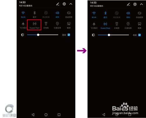 首先,在新、旧2台手机上都打开Huawei Share。从手机上方下滑,打开状况栏,然后选择Huawei Share并点亮: