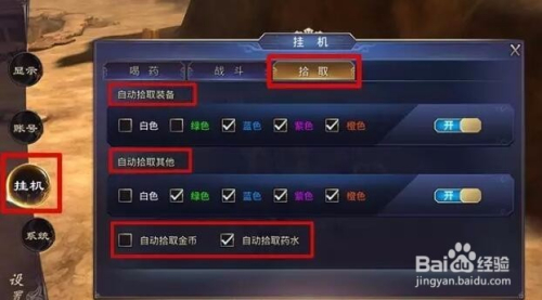 3. 【保举】在细节设置中,勾选【主动收受接管拾取装备】,并选择需要主动收受接管的装备的品质,即可完当作【主动收受接管】的设置,如许可以有用清理包裹,释放包裹空间,挂机时可持续拾取物品