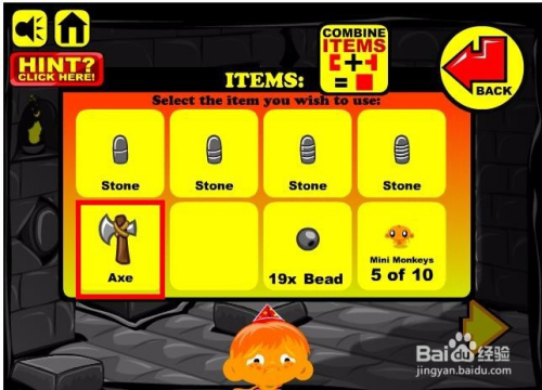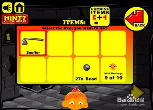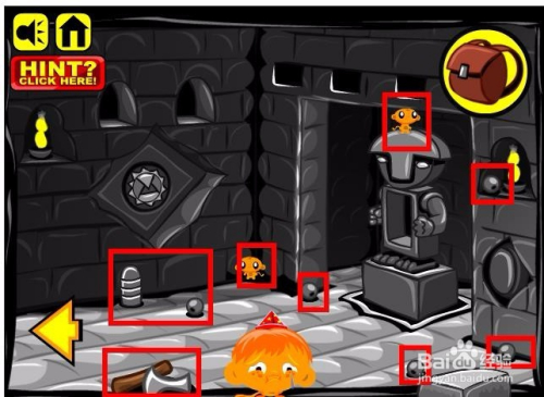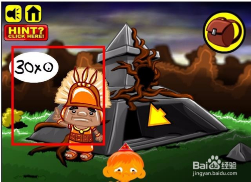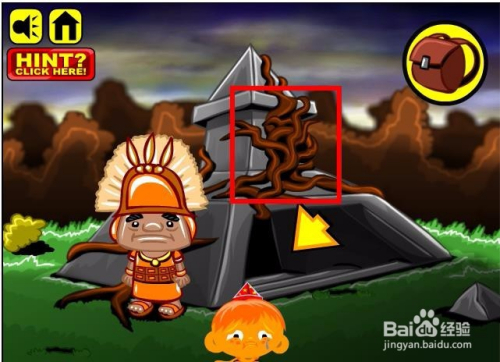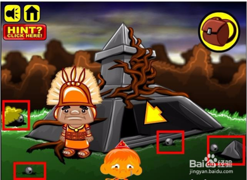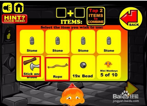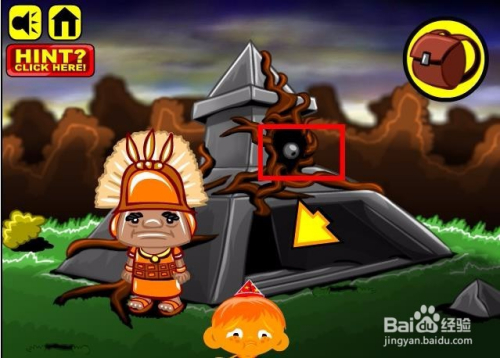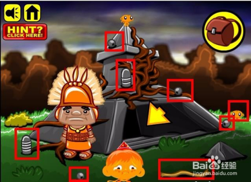 进入游戏,选择脚色以及头饰,然后进入到本家儿画面收集画面中所有能收集的物品,这里本家儿如果小山公和一个铁球还有枪弹状的螺纹石头,同时这里还有条绳索。