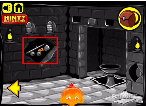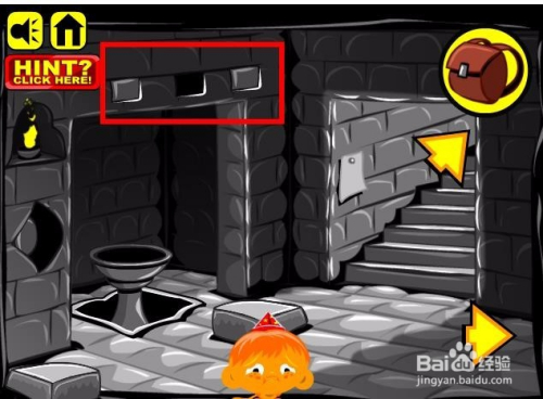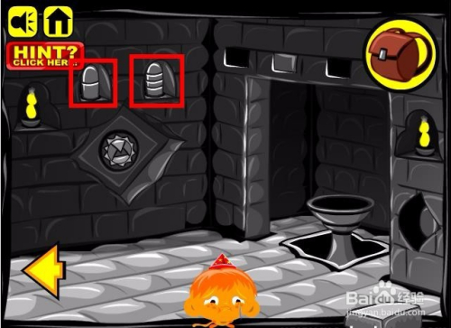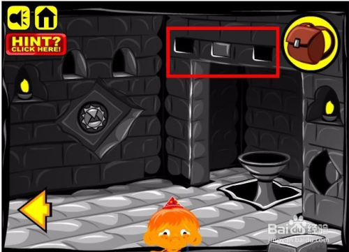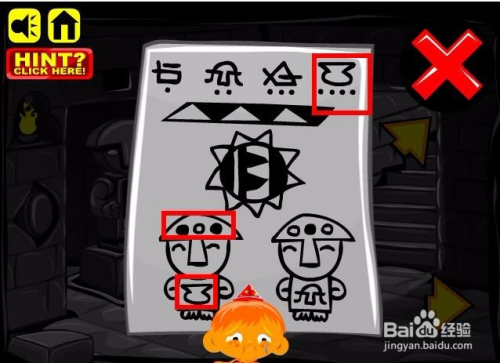 接着进入洞里边,在墙上贴着一张纸,上面画着一些符号,纸上左侧的人像额头上边有口角黑的圆形摆列,同时肚子上画着一个符号,符号在最上面一排,对应的四个圆点,这里四个圆点对应四个螺纹的枪弹状物体,将四个螺纹的物体放入洞里雕像的肚子处,然后点选上边的石块为口角黑。