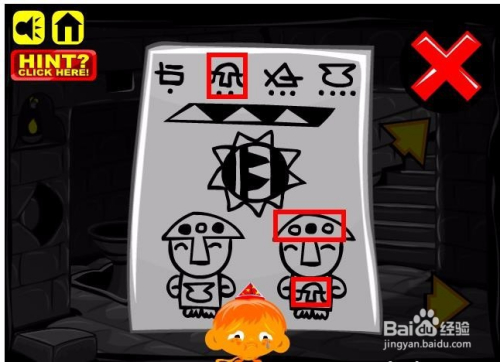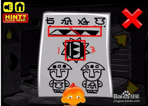 接下来查看纸上太阳符号的中心,有个1和三的符号,这代表左边为1,右边为3,在洞里太阳符号的上边洞口处放入对应的1个螺纹石头和三个螺纹石头,左为1,右为3,然后点击墙面的太阳符号,最终获得一个火罩,还有小山公和铁球。