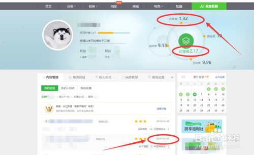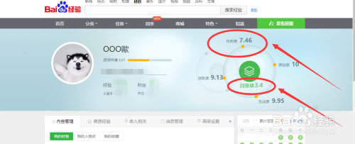 大师可以看到,当我发布了六篇三星原创经验,那么我们在看到的优质度在7-8之间,而此时的会享度在3.3-3.5之间,而我们的收入也会比发布五篇的时辰高了很多多少 。