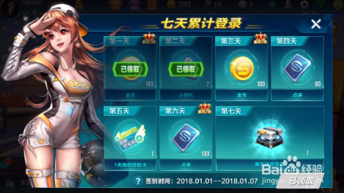 2018.1.1-1.7七天中,错过签到机会,用50点券作为补签资本来续签;